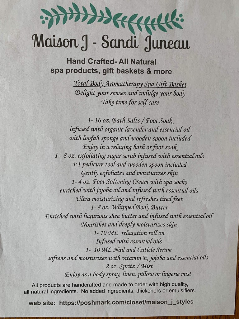 1- Large bath salts/foot soak 16 oz. 1- exfoliating sugar scrub 8 oz. 1-foot softening cream 4 oz. 1- body butter 8 oz. 1- spritz/mist 1- nail & cuticle serum 1-essential oil roll on Wooden spoons included Included: Spa plus up package: spa socks, pedicure tool, loofah sponge